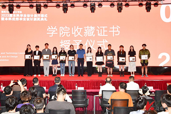 會上,宣讀了獲得本科優秀設計作品學生名單及收藏作品學生名單,并為獲獎同學頒發了榮譽證書與收藏證書。李勝利寄語畢業生,他希望同學們能夠保持對藝術的熱愛與執著,勇敢面對困難和挑戰,加強多元文化之間的互動交流,用藝術講好中國故事。指導教師代表管歆代表學院為畢業生送上美好的祝福,她希望同學們在今后的道路上學會感激與尊重,學會寬容和助人,不論順境或逆境都能樂觀奮斗、百折不撓。學生閆航宇代表全體畢業生發言,他首先感謝學校為大家提供廣闊的平臺和諸多的幫助,希望同學們經過不懈的努力都能像玉石一樣綻放出溫潤而奪目的光亮。
