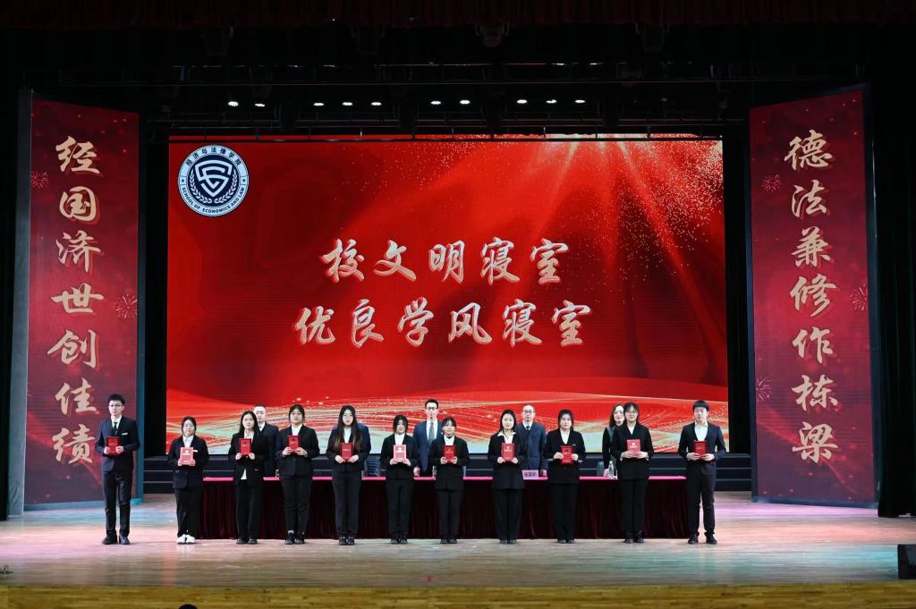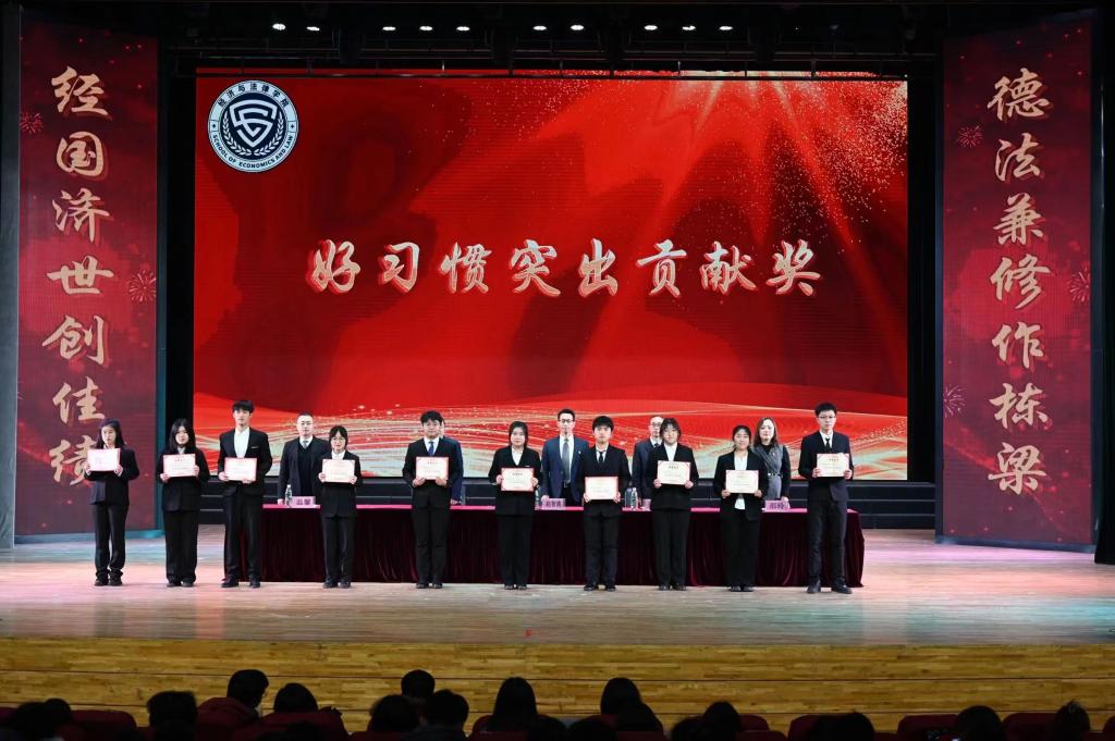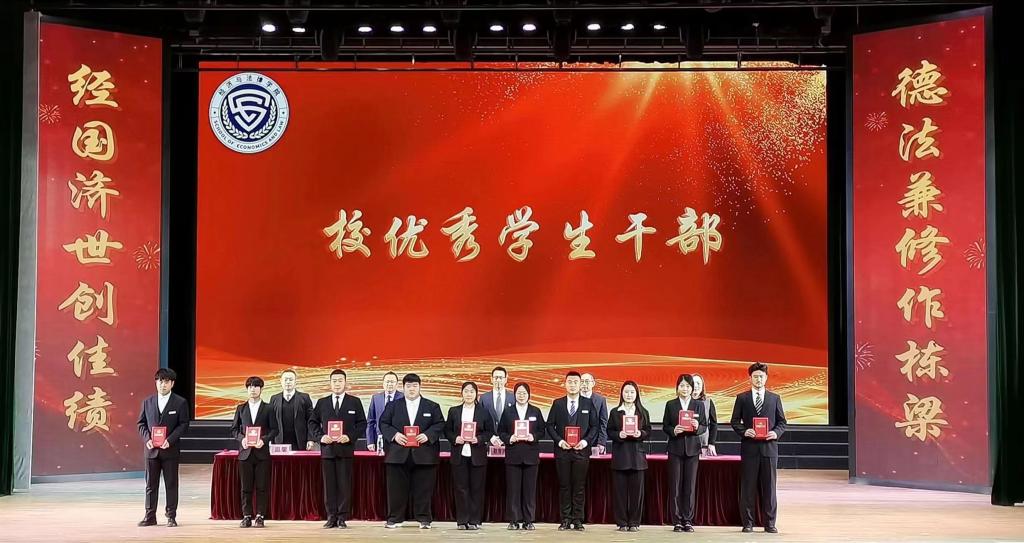 在經法學院副院長溫馨宣讀評優表獎名單后,與會領導為獲得榮譽的36個優秀集體和113個優秀個人頒發榮譽證書并合影留念。每一位獲獎成員臉上都洋溢著自豪的笑容,觀眾席上掌聲陣陣,現場氣氛熱烈。學生骨干突出貢獻獎獲得者吳雨純作為學生代表發言,她向悉心教導學生的學院領導和老師們表達了真摯的感謝,并鼓勵同學們以嚴謹務實的求學態度、科學高效的學習方法刻苦鉆研,力爭上游;同時注重理論和實踐相結合,提高綜合素質,實現全面發展。