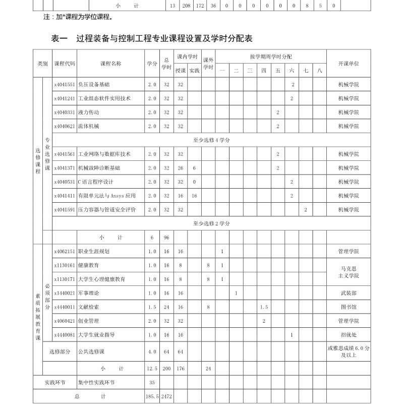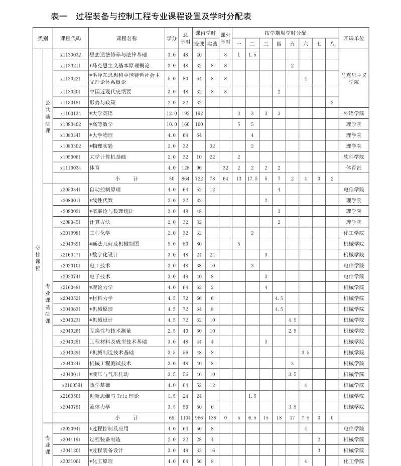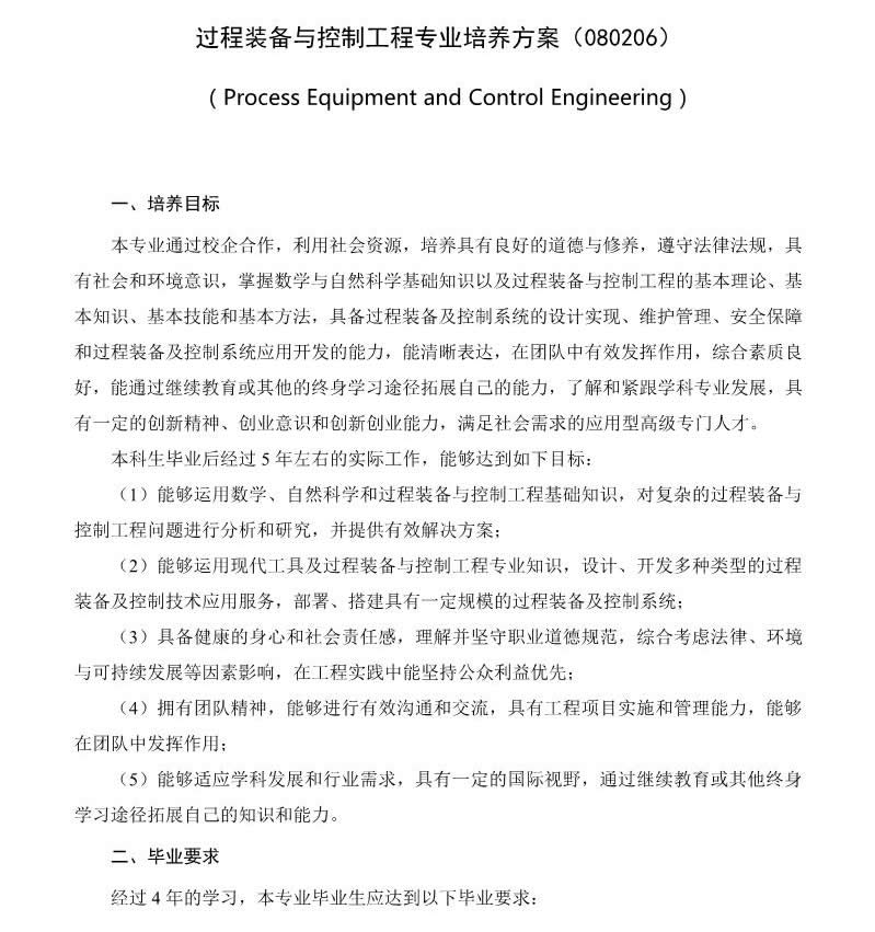 過程裝備與控制專業(yè)培養(yǎng)方案(080206)(2017版)