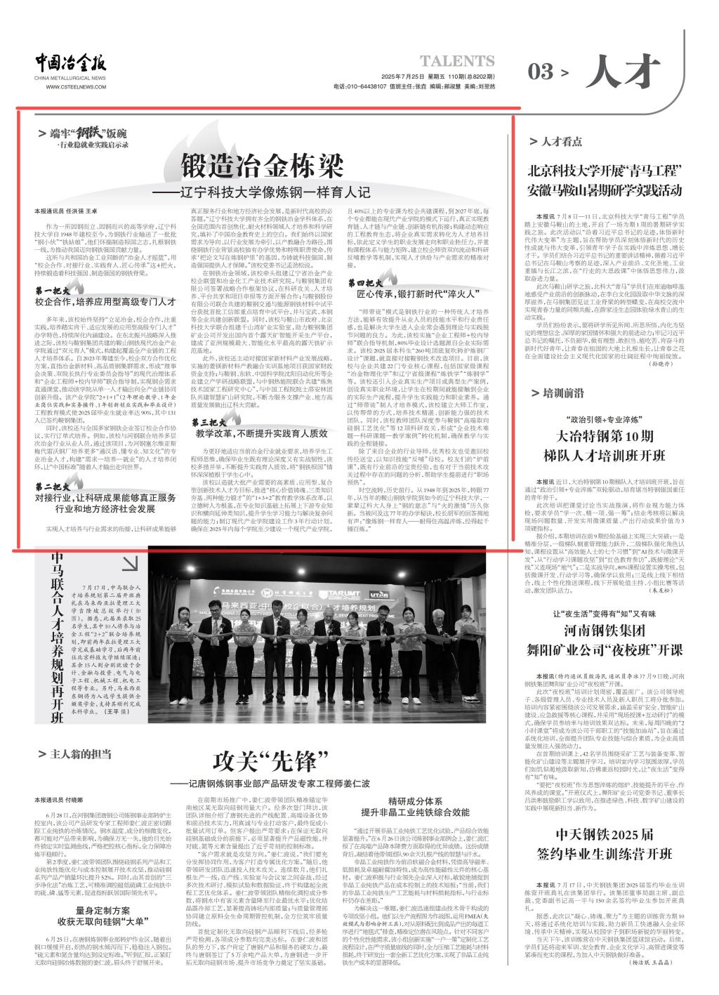 7月25日出版的《中國冶金報》紙媒第3版(人才版)以《鍛造冶金棟梁——遼寧科技大學像煉鋼一樣育人記》為題,報道了學校通過校企合作、對接行業、實踐育人、匠心傳承等方式,為推動我國邁向鋼鐵強國貢獻了遼科大的智慧與力量。