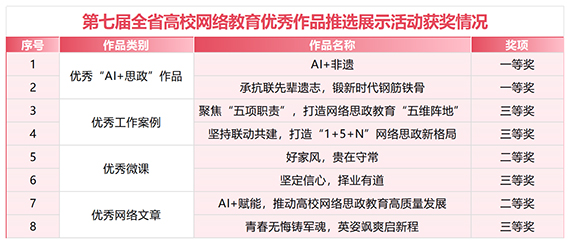 此次活動以“爭做校園好網民,凝聚網絡正能量,奮進強國新征程”為主題,設置光影趣青春、影像創意匯、網圖新視界、網語青年說等7個賽道面向全省高校大學生征集網絡文化作品,設置優秀網絡文章、優秀工作案例、優秀AI+思政作品等5個賽道面向全省高校教師征集網絡教育優秀作品推選展示項目。學校推選的“承抗聯先輩遺志,鍛新時代鋼筋鐵骨”等2項作品獲一等獎,“青春·有光”等12項作品獲二等獎,“以青年夢燃非遺傳承之光”等18項作品獲三等獎。