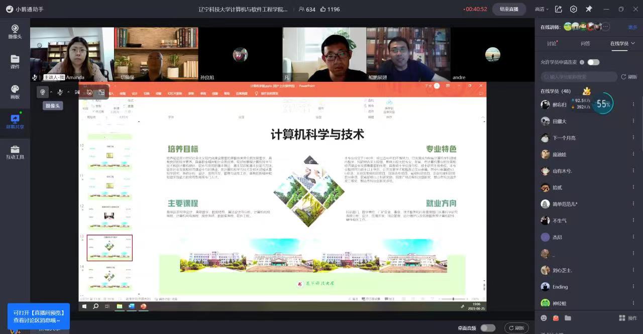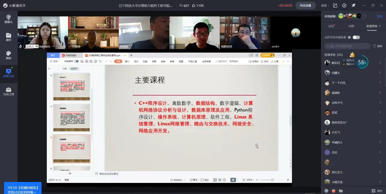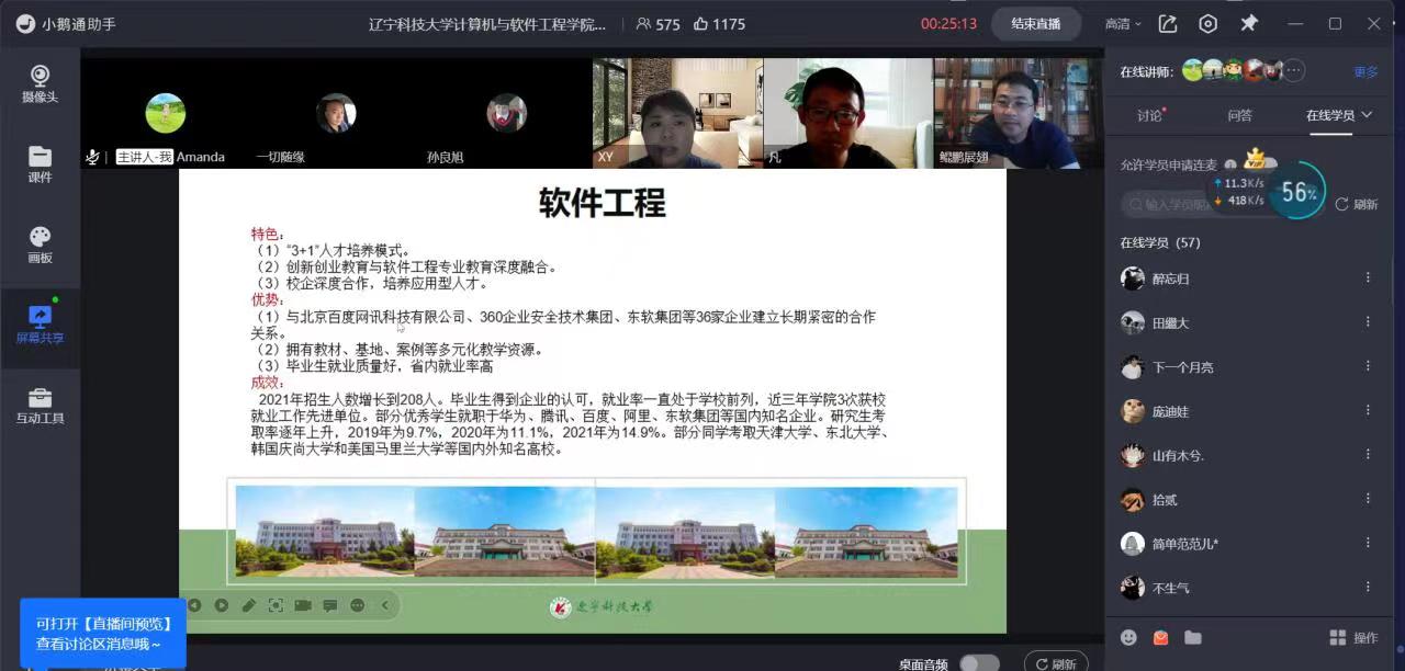 為了讓考生更加直觀地了解學校特色和學科發展,切實提高本科生源質量,計算機與軟件工程學院充分利用高考至志愿填報截止這段關鍵期、黃金期,做好招生宣傳工作。6月25日晚,計算機學院線上召開招生宣講會,由學辦主任隋麗玲主持,學院黨委副書記李春生、各系主任、校企合作單位中軟國際教育科技集團陳偉俊總監依次進行宣講。本次宣講會重點面向學院18個生源基地高中,吸引了740名考生及家長觀看。
