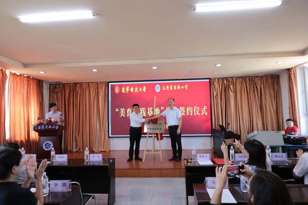 活動伊始,藝術學院院長李囝對開展美育浸潤計劃工作的重要性進行了發言,美育教育能夠培養同學們的綜合素質,讓同學們都切實感受到藝術,感受到美,這正是我們此行的目的。隨后,王府鎮蒙古族小學校長敖連玉也表示歡迎美育工作對接到自己的學校,一定以此為契機,加大對學生美育教育的投入和注重美育人才的培養,希望雙方實現更深層次合作。之后,遼寧科技大學黨委副書記孫曉華與王府鎮蒙古族小學現場簽約,雙方簽署了“美育實踐基地”合作協議,接下來,遼寧科技大學黨委書記李平與王府鎮蒙古族小學進行了“美育實踐基地”揭牌儀式。
